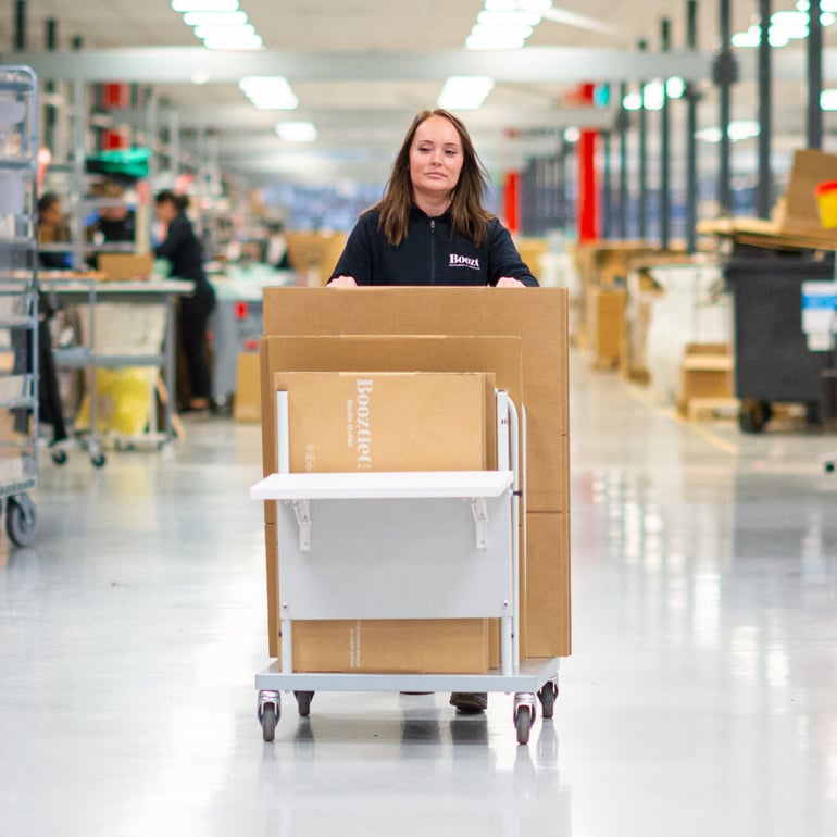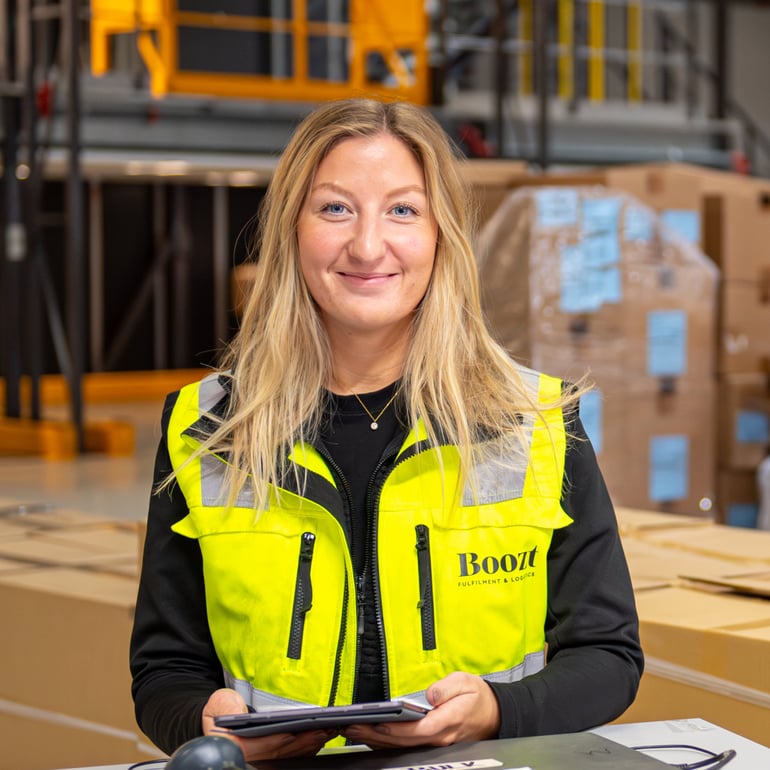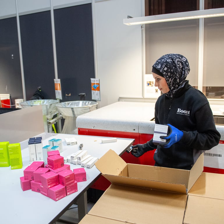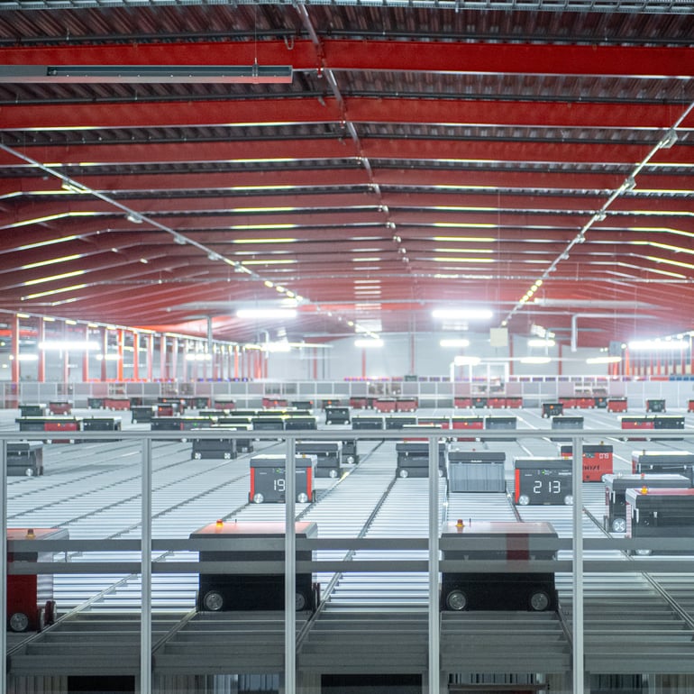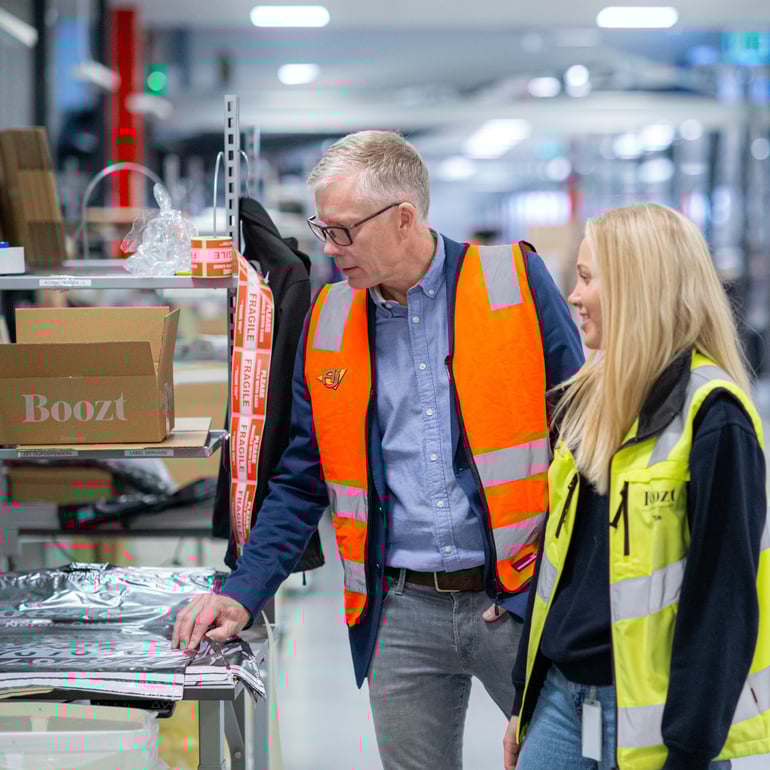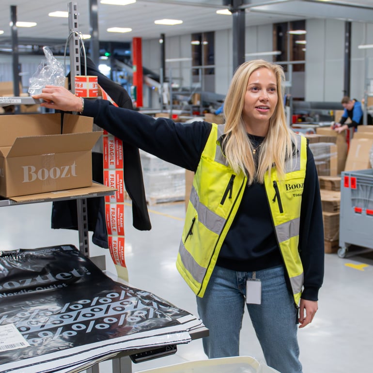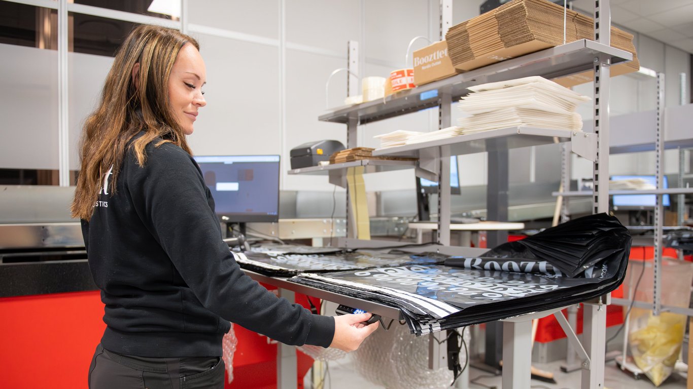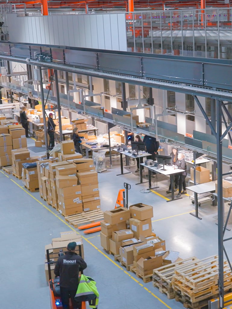The atmosphere buzzes from the machines that slide along rails on the ceiling. It's an impressive sight, showcasing the cutting-edge technology behind Boozt’s state-of-the-art robotic warehouse. The picking work is done automatically, but several important steps require a human hand. New goods that come in need to be registered and all orders are packed by the staff.
