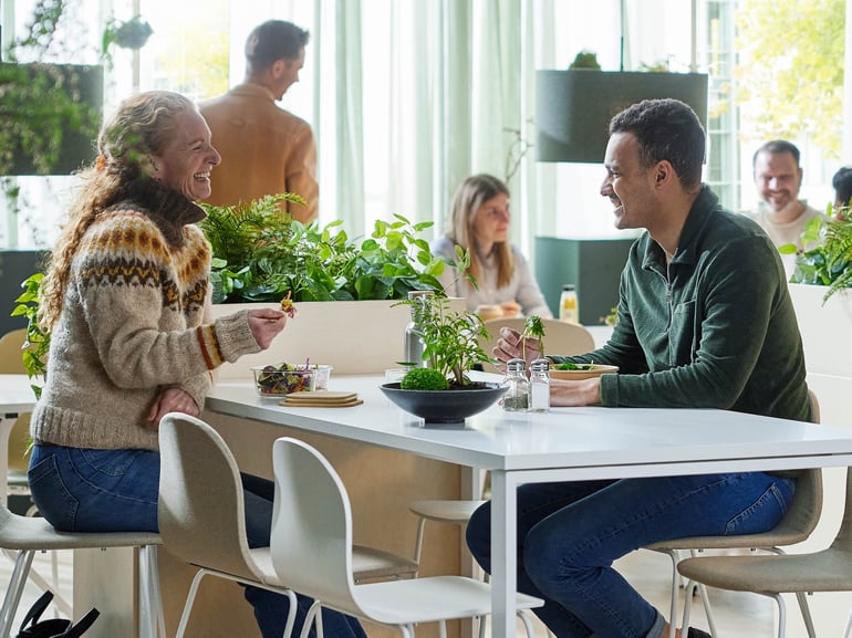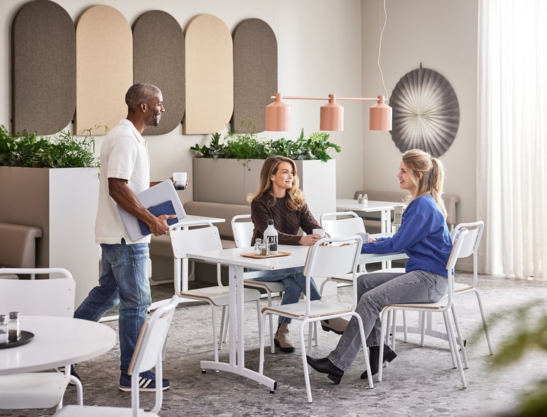 For example, placing smaller tables near entrances works well for quick breaks or coffee stops. Further into the room, larger tables can support group lunches or team catch-ups without disrupting the flow of people coming and going.